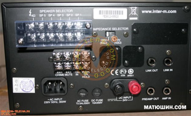 В усилитель могут быть установлены блоки тюнера Inter-M PAM-T, кассетного магнитофона Inter-M PAM-D (в настоящее время уже не поставляется) и CD-проигрывателя Inter-M PAM-CDA, для чего на лицевой панели есть два отсека. Следует, однако, учесть, что одновременное подключение блоков Inter-M PAM-D и Inter-M PAM-CDA не допускается. На выходе усилителя стоит кнопочный селектор на 5 зон оповещения, позволяющий выбирать как любую из зон, так и все сразу. Суммарная мощность нагрузки (мощность громкоговорителей) НЕ ДОЛЖНА превышать номинальную мощность усилителя. Индикатор уровня сигнала позволяет контролировать аудиосигнал на выходе усилителя. С помощью 2-х полосного регулятора тембра можно изменять АХЧ выходного сигнала.