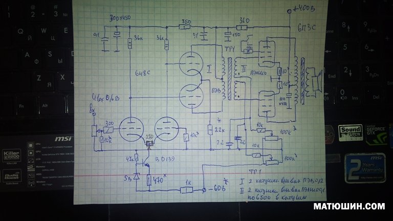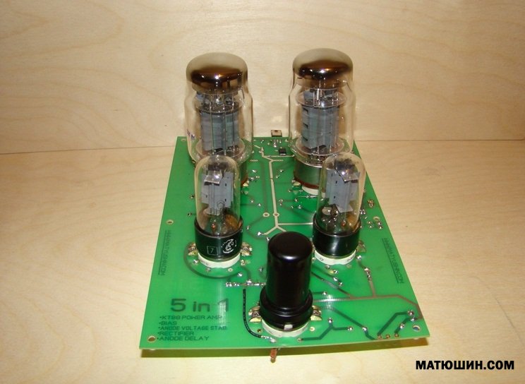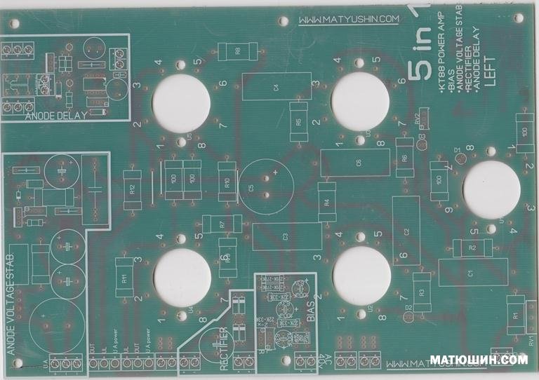 Помориным Иваном. К слову Иван остался доволен после долгих поисков. В усилителе применены лампы 6С5С на раскачке фазоинверсного каскада реализованного на триодах 6Н7С. Из схемы видно что предварительная часть усилителя питается через анодный стабилизатор, таким образом стабильность его работы не зависит от отбора мощности лампами выходного каскада , что в свою очередь довольно сильно сказывается на динамике усилителя в положительную сторону + возможность полностью освободиться от электролитических конденсаторов в цепях питания предварительного каскада. В кратце о стабилизаторе. Стабильность его работы обусловлена применением интегральной микросхемы линейного стабилизатора, позволяющего регулировать напряжение в пределах 1,5 до 450В. На выходе он умощен полевым транзистором типа IRF740. падение напряжения для осущ. стабилизации достаточно порядка 50В. Режим работы усилителя -класс АВ, смещение фиксированное. Анодное питание Мост на быстрых диодах и в связи с этим в устройстве усилителя есть устройство - таймер прогрева ламп усилителя пониженным напряжением питания. При такой идеологии построения усилителя можно в легкую отобрать от него при желании максимальную мощность. а именно 100Вт. При соответсвующем напряжении Анода выходных ламп и выходного трансформатора соответствующей мощности. В базовом варианте был применен тороидальный выходной трансформатор габаритной мощностью 500Вт, с приведенным сопротивлением 6К. Размеры печатной платы 170х250мм.