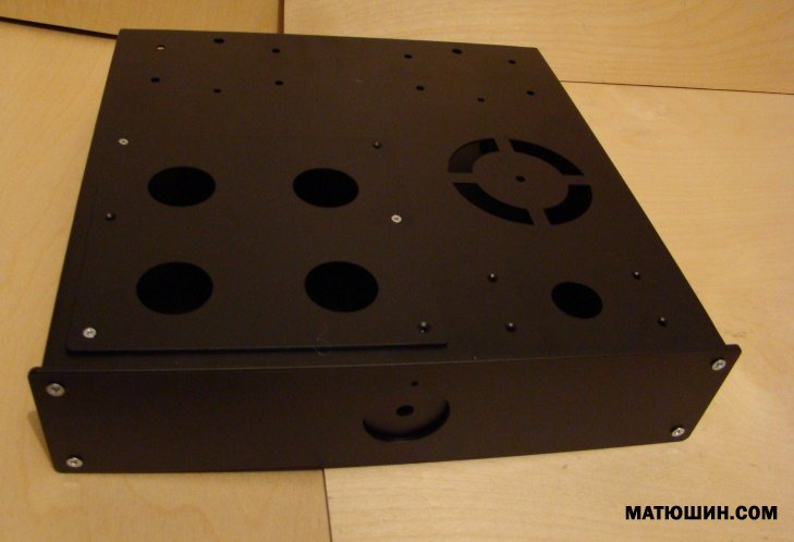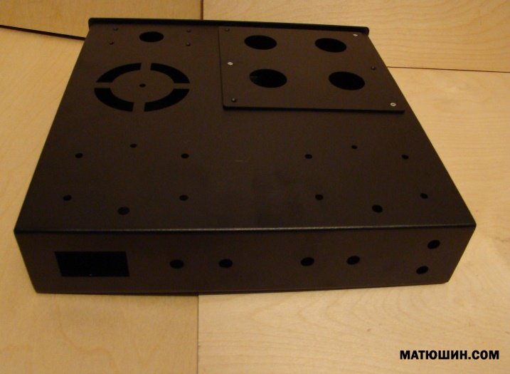 Размер корпуса 330х330х70мм. Корпус изготовлен из стали 1,5мм и покрашен порошковой краской,под уже имеющуюся на сайте печатную плату ( 3я стр. 6С5С-6П9), с правой стороны место для силового трансформатора и платы кенотронного питания усилителя, с левой стороны место под печатную плату, которая устанавливается в нише корпуса на стойках, рядом с тыльной стороной место под выходные трансформаторы( их можно увидеть так же на сайте ТВЗ-100SE , с боковыми крышками), на тыльной части посадочные места для разъема сеть, выходов на акустику и входов (10мм). На передней панели отверстие для светодиодного индикатора и для резистора регулятора громкости 8мм/42мм.,ручка так же есть на сайте в разделе "комплектующие"3я стр. Корпус-