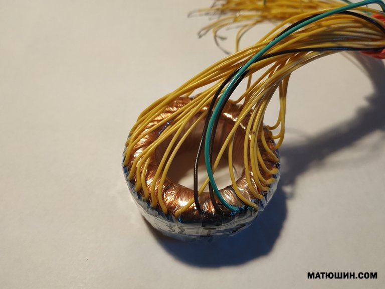 4,4К 0-4,8 Ом нагрузка, секционирование, трансформатор разбит на две половинки. на каждой из них своя обмотка, первички последовательно, вторички параллельно, в общей сложности 6 секций вторичек проводом 056мм,габаритная мощность 120Вт, железо типа 3408. размеры:Ш-95,Выс.-80,набор 40мм 2Кг.