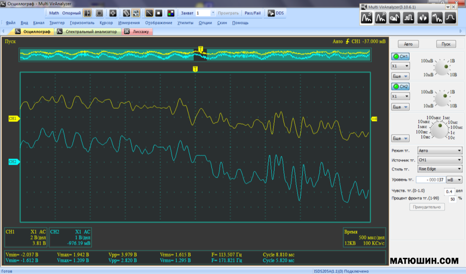 Аудио сигнал сравнение формы сигнала вход/выход (желтый входой сигнал), все хорошо