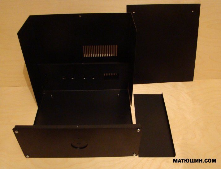 Корпус "Универсал-1" для одного RCA входа и для четырех выходных клемм, внутри корпуса предусмотрена платформа для монтажа компонентов с разделительной пластиной на сектор питание-усилитель. Краска порошковая. Размеры корпуса 300х280х120мм, размер отверстия для ручки управления регулятор громкости во фронтальной панели 42мм., разъем сеть - блок в комплекте.. В данном корпусе можно установить усилитель РР 6П15П, SE 6П15П, SE 6П1П, SE 6Ф3П с кенотронным питанием. Пример исполнения см. раздел "Ламповые усилители".