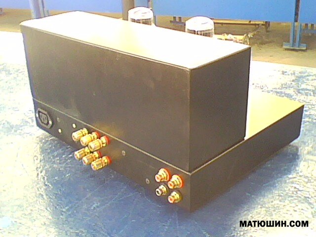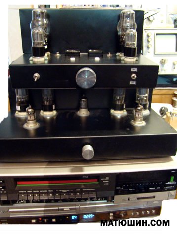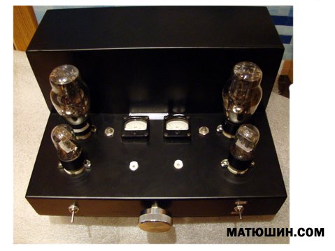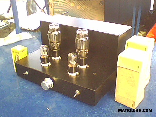 Однотактный усилитель на прямонакальном триоде 6С4С (лампа в коментариях не нуждается). На раскачке 6Н9С (в паралель). Для контроля тока выходных ламп на передней панеле установлены 2 стрелочных прибора и 2 подстроечных резистора для оперативного регулирования (в небольших пределах) тока выходных триодов. Два светодиода индицируют напряжение накала. Коммутатор на 2 входа. Нагрузка-4 и 8 Ом. Выходные трансформаторы намотаны на железе от ОСМ-0,16(160 Вт). Габаритные размеры: ширина-340мм. длина--250мм. высота-50мм. высота по колпаку--180мм. Цена такого изделия-25т.р.